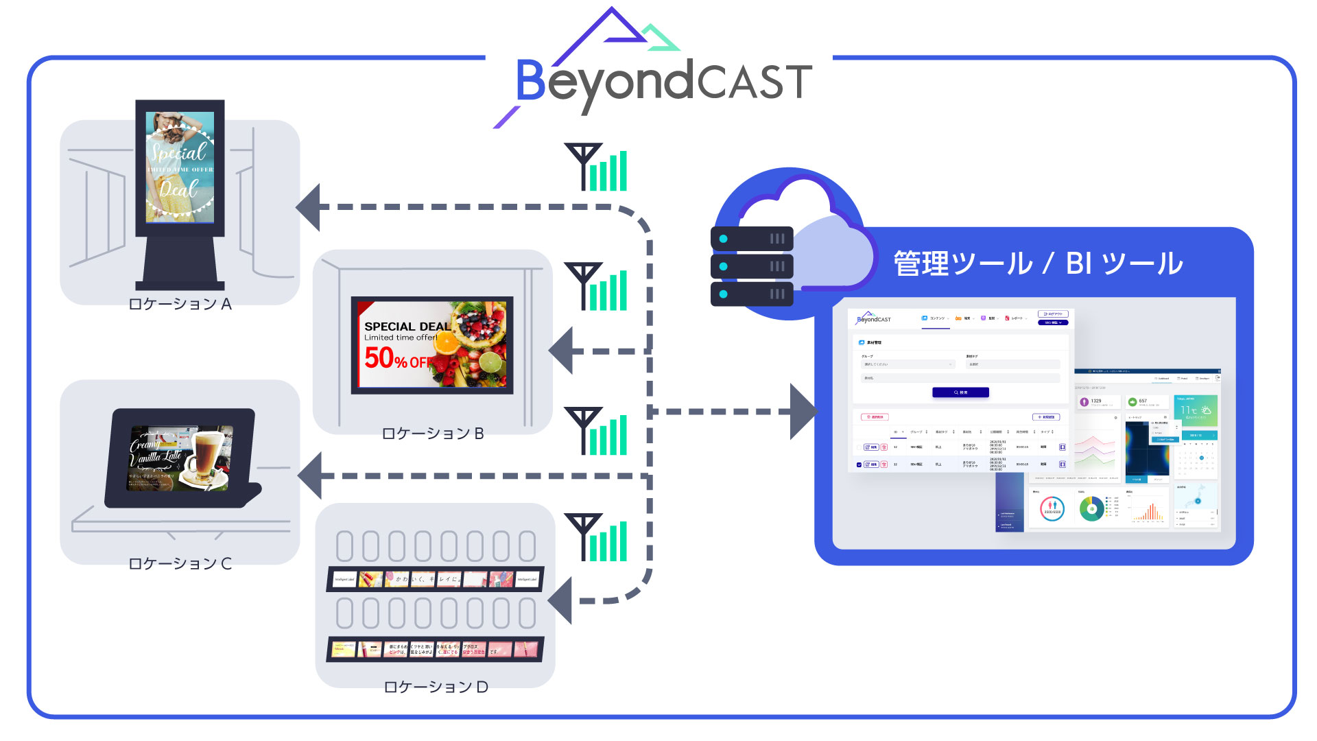 ・コンテンツ配信/管理機能(表示内容が確認できます) ※スケジュール機能/一括グループ機能 ・稼働状況確認機能(非稼働端末について即時に把握できます) ・接続端末管理機能(個別端末ごとに管理できます) ・クラウドストレージ機能(コンテンツ保管) |