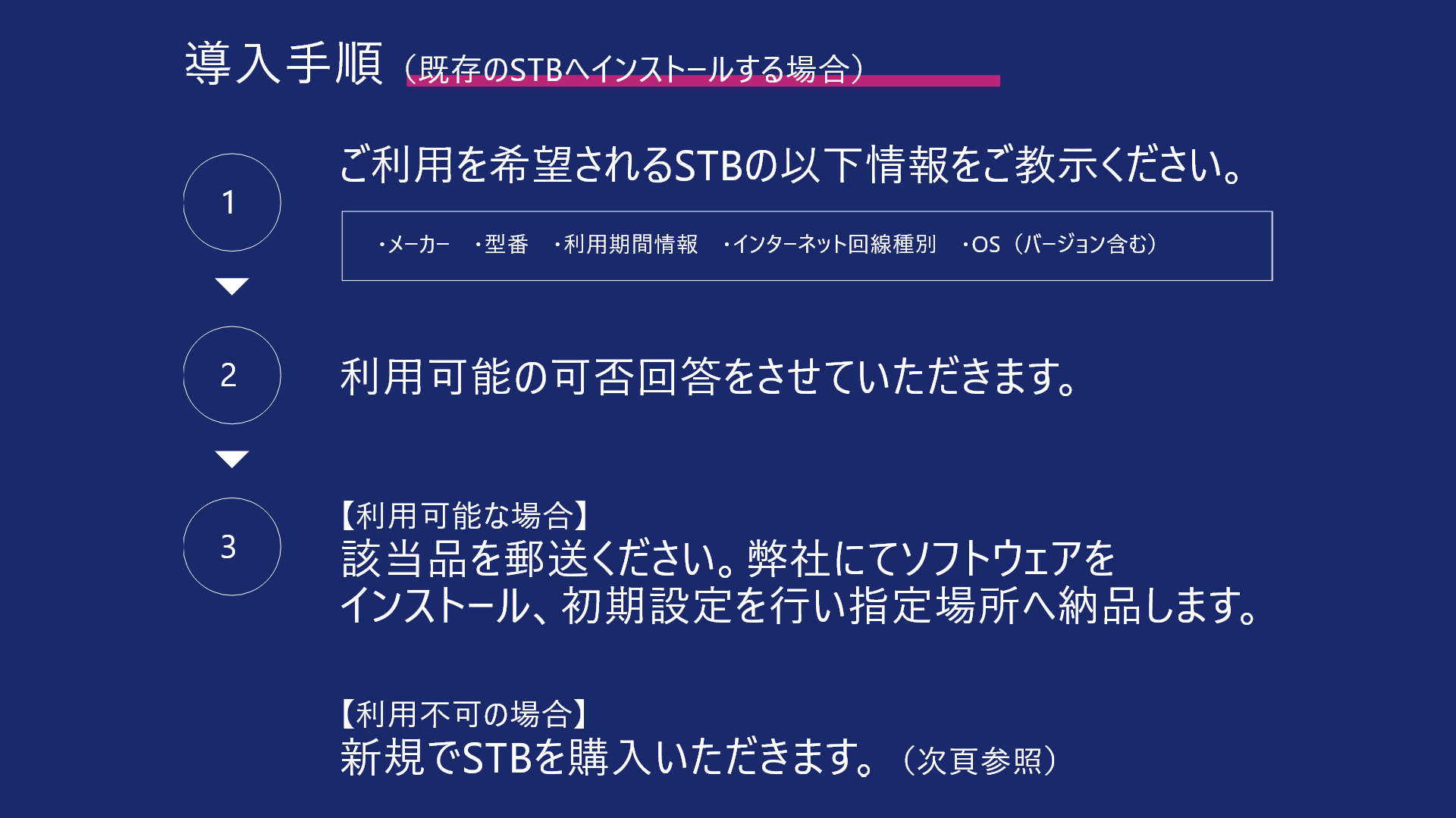 ・初期費用なし/月額利用料制度を採用 ・単位 1STBごとのライセンス利用料単位 ・参考価格:月額 1,480円(税抜)/1ライセンスあたり |