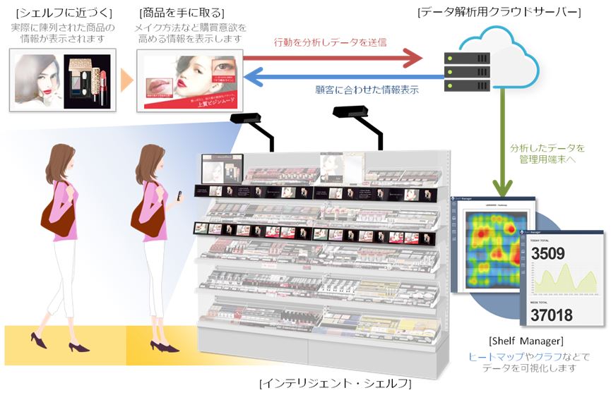 「インテリジェント・シェルフ™」は、店舗の商品棚にマイクロデジタルパネルを取り付け、インターネット経由でそれぞれの商品情報をリアルタイムに発信することができるだけでなく、モーションセンサーや顔認識センサーなどを連携させることで、顧客の棚前行動を把握・分析することができるサービスです。