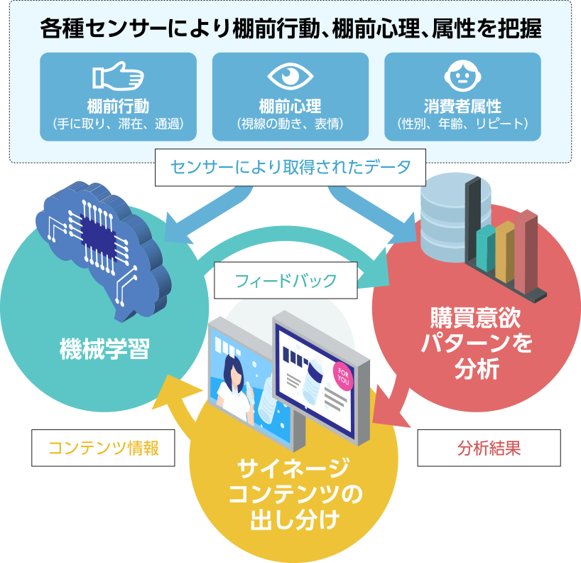 今回取得した特許は、商品棚前における消費者の表情および視線に基づいた棚前心理および消費者の動きに基づいた棚前行動を各種センサーで把握して購買意欲を総合的に分析し、商品棚に設置したデジタルサイネージを介した購買支援を行うシステムに関するものです。