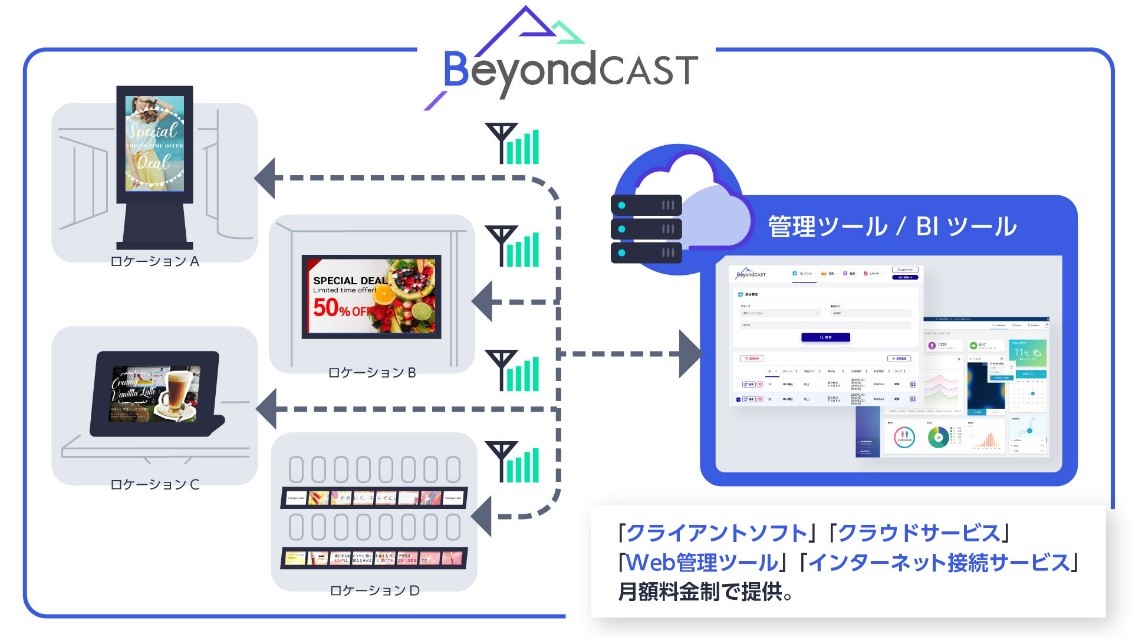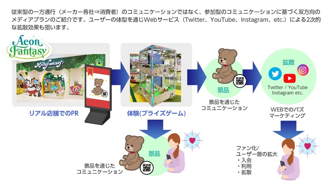 「ストアメディアサービスは、店頭サイネージモニターおよびプライズゲーム内のサイネージモニターにおいて、連携配信される動画広告とプライズゲーム内における商品提供を連携させた体験型の広告商品です。クライアントはこれらのサービスを通じて体験型の広告サービスを提供することが可能です。